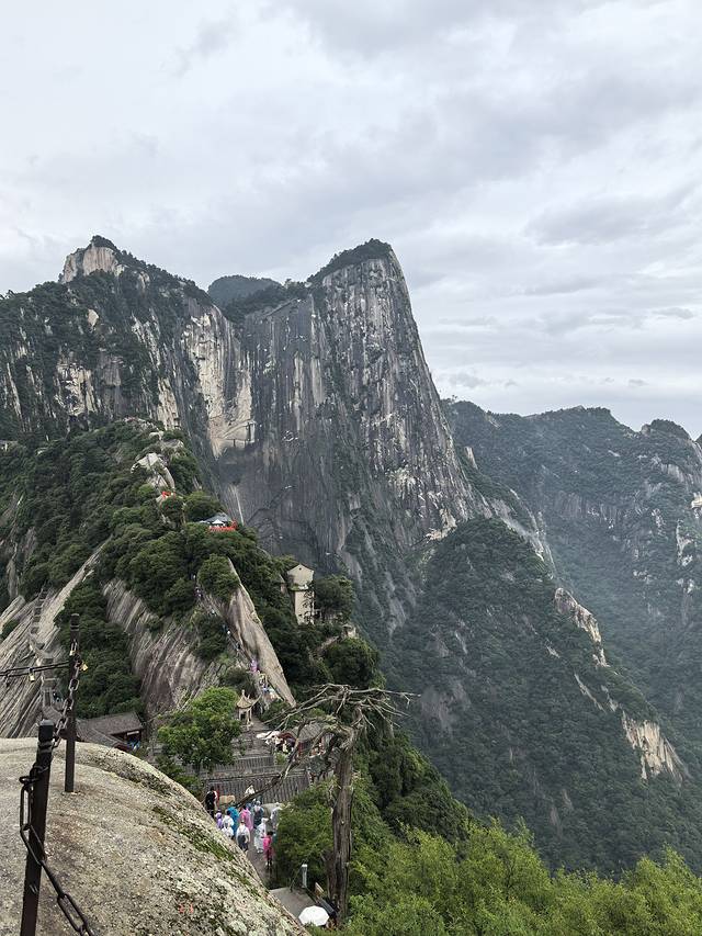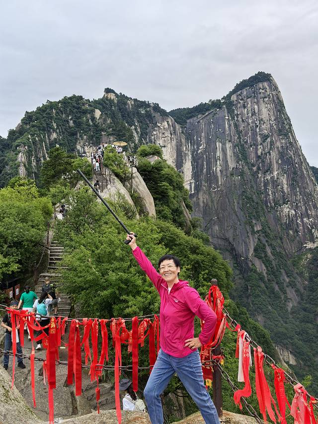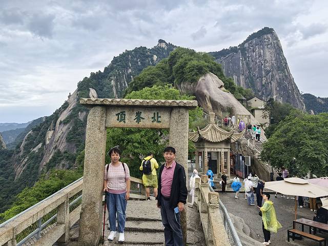 华山北峰,又称云台峰,是华山的五个主峰之一,海拔最矮1614米,以其险峻和丰富的文化景观而闻名。背后右侧山尖是华山西峰。