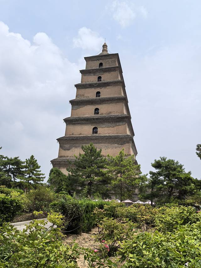 大雁塔位于唐长安城晋昌坊(今陕西省西安市南)的大慈恩寺内,又名“慈恩寺塔”。唐永徽三年(652年),玄奘为保存由天竺经丝绸之路带回长安的经卷佛像主持修建了大雁塔,最初五层,后加盖至九层,再后层数和高度又有数次变更,最后固定为所看到的七层塔身,通高64.517米,底层边长25.5米。