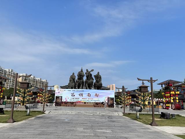 南阳卧龙岗,景区门口的三顾广场的刘备、诸葛亮、关羽、张飞的朔像