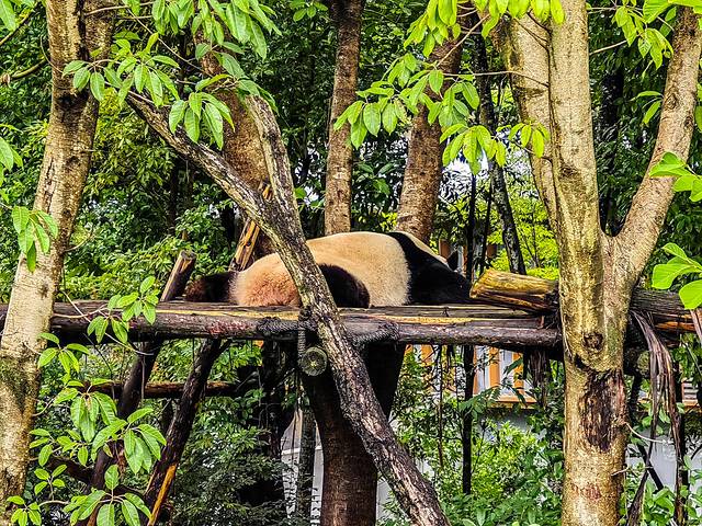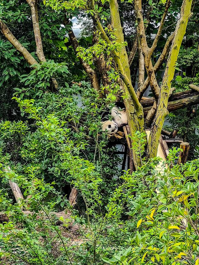 上午乘坐网约车行驶约1小时,到达成都大熊猫繁育基地。由于预购了门票,所以直接刷身份证就可以进入(多处景区实行60岁以上老人免票政策,有点受宠若惊)。基地内有多处供熊猫休闲的封闭场所,内有露天园子和室内休息室,天气凉爽时大熊猫会在园子内玩耍,天气炎热时,大熊猫就躲在开着空调的休息室内,这时候只能隔着玻璃观看了,所以尽可能选择上午参观,有可能在室外看到熊猫玩耍,不过天热时,他们多数时间在睡觉,能翻个身都是给足观众面子啦。