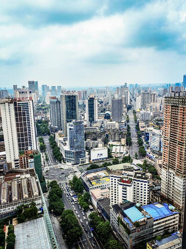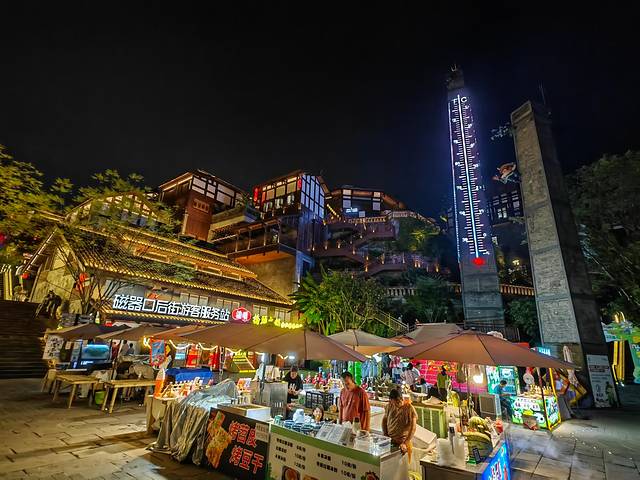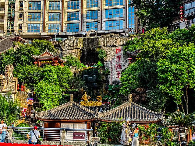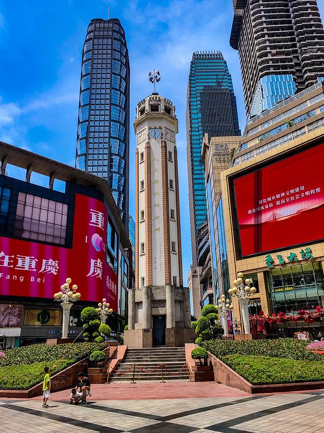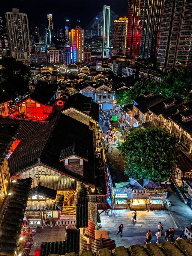 在夜游两江的游船上可以拍摄到洪崖洞大全景,角度极佳。下船后,滨江路上人满为患,很难停下脚步拍个照片,当然也没有这个心情,只想着尽快逃离这片“人从众”区域。按照网上攻略找到创富中心5号电梯,直升22楼,出来就是很大的广场和魁星楼,再步行十几分钟就到了解放碑步行街。