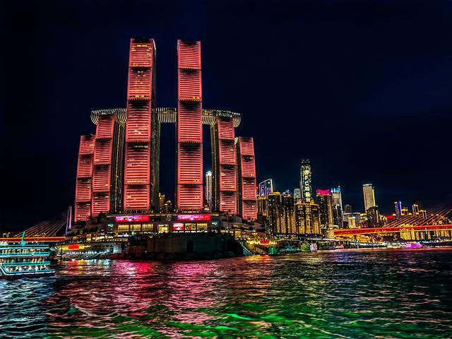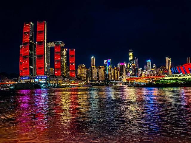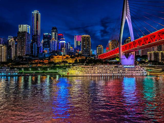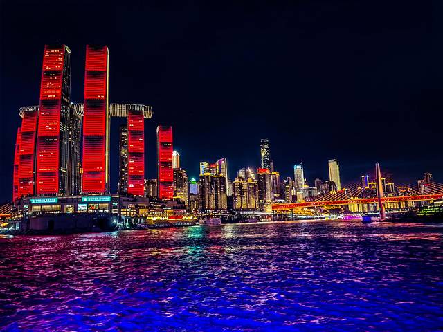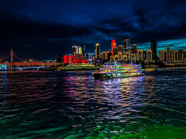 不览夜景,未到重庆。重庆两江夜游,巧妙地将重庆山水与闻名天下的重庆夜景相融合。在游船上吹着微微江风,品茶观景,如痴如醉。灯火辉煌的渝中半岛、璀璨夺目的滨江路、波光粼粼的长江水、流光溢彩的跨江大桥,交相辉映。沿江的洪崖洞、千厮门大桥、来福士等高低不同、形状各异的建筑,在灯光的照耀下错落有致,美轮美奂。