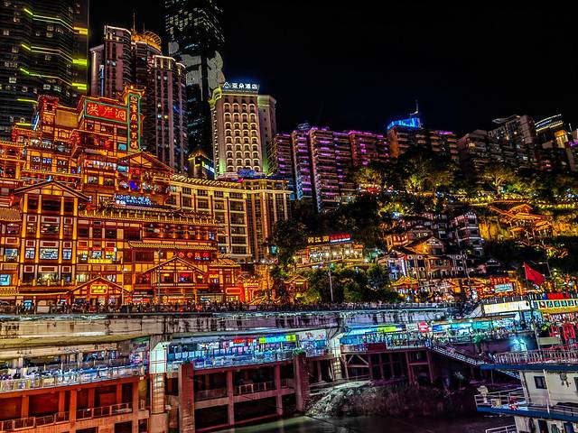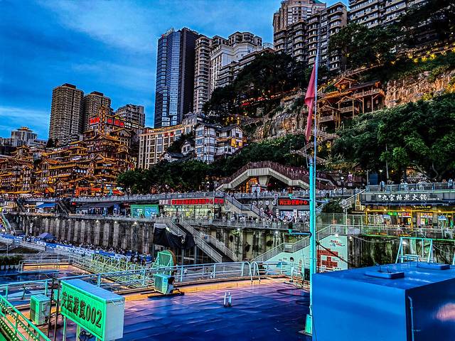 沿江有朝天门、洪崖洞等多个游船码头,预购船票后,一定要看清发船的码头,夜游两江船是晚上19:30分~22:00点滚动发船,船票不限班次,夜游时间约60分钟。建议最好乘坐第一班船,天渐暗、灯初亮,拍照很出片,而且游人较少。一般20:00点以后,大量游人蜂拥而至。