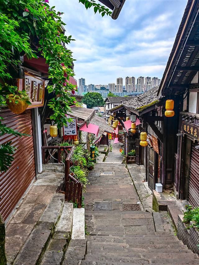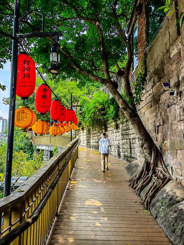 由酒店步行十几分钟,就到达山城巷入口处。在步道的石板坡段的崖壁上修建了一条可观江景的悬空栈道,栈道在长江边、沿金汤门古城墙,顺山势而建。在栈道上顿足观望,长江南岸的景色尽收眼底。沿着悬空栈道爬坡而上,在仁爱堂旧址小息后,由上而下返回山城巷入口,往返约2个小时,漫游很轻松愉快。