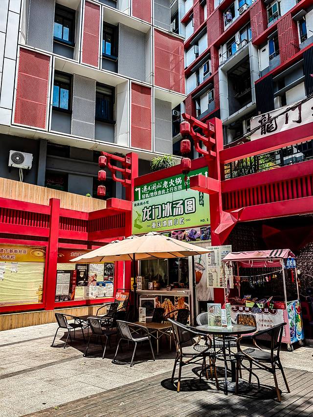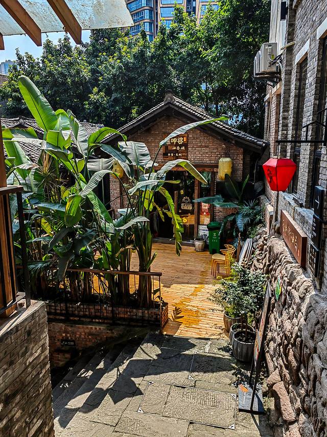 酒店距离湖广会馆2.5公里,打车10分钟,步行要半个小时,有点尴尬。如果不是在酷暑,步行休闲也不错。打车去湖广会馆,游览耗时1.5小时,再步行十几分钟到达长江索道北站,预先购票,到现场取号排队,大约等待1小时后乘上大名鼎鼎的“长江索道”,横跨长江,这已经成为了山城的代表性项目。在索道南站出来,过个马路就是龙门浩,找个冷饮摊点了一碗玫瑰醪糟冰汤圆,降降温。由于夫人体力透支,就放弃了原计划的龙门浩和下浩里老街。