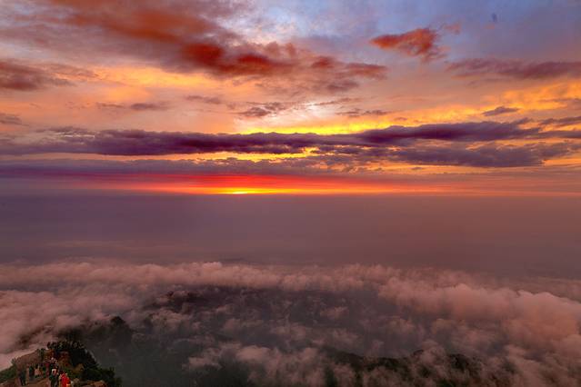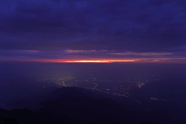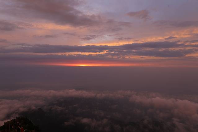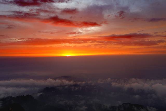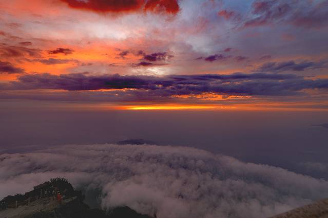 早上五点的闹钟唤醒我,我再次背包出发,刚出山荘,大路上已是人头攒动,人声鼎沸,这是夜爬大军赶到了。他们在完成15小时以上攀爬之后,选准在日出前登顶,这最后的冲刺,因为亢奋而动能十足,步伐坚定,不得不佩服!更让我尴尬的是,待我上来金顶,好机位都已挤满了人群。
