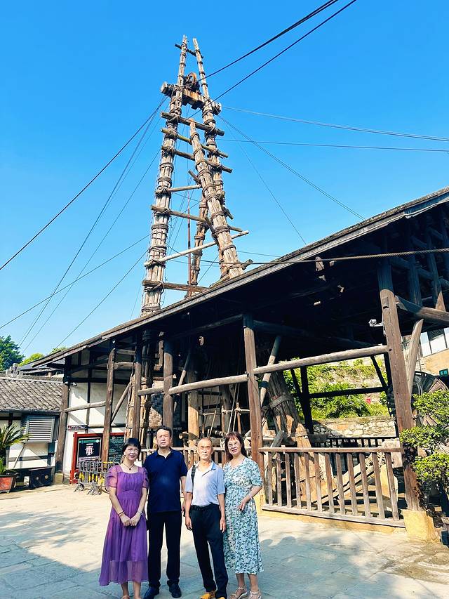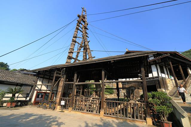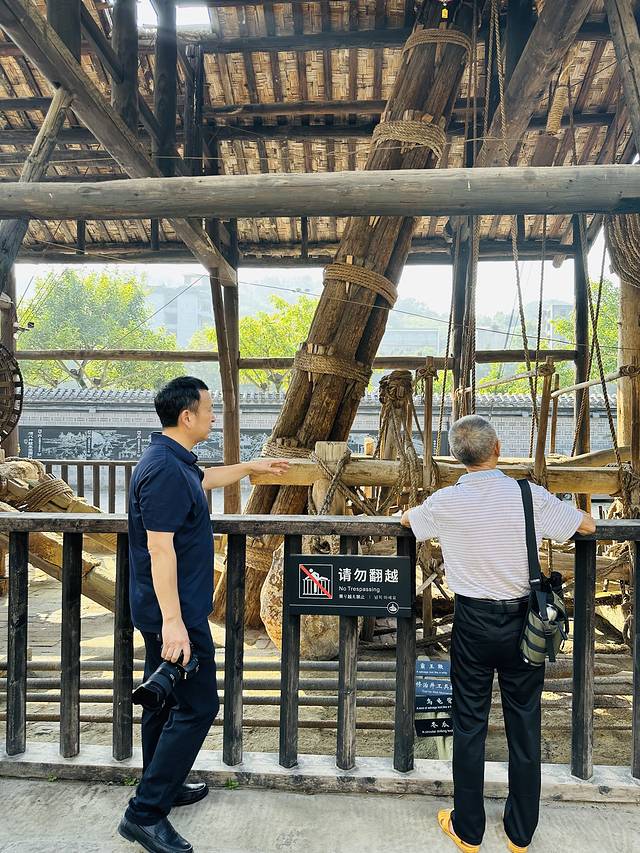 井的开凿,使各地盐绅商贾纷至沓来,并在其周围凿井设灶,当地“天车”林立、锅灶密布繁荣景象。讲解员介绍自贡天车曾经上万,现仍有19台,但只有这一台仍在生产。