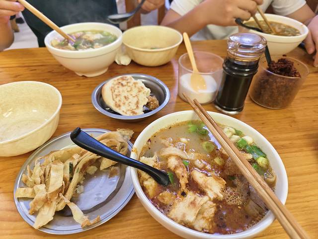 10块钱的牛肉汤份量够足,免费加汤,据说越早喝汤味越浓郁,一定要赶早,自己根据口味加盐。丸子脆脆的泡汤里好吃,饼丝和饼都是一块钱一小盆。也有人推荐南关小碗牛肉汤和马杰山牛肉汤。