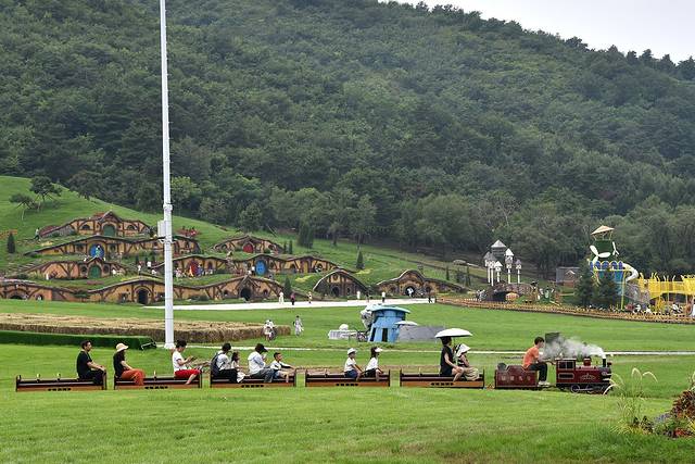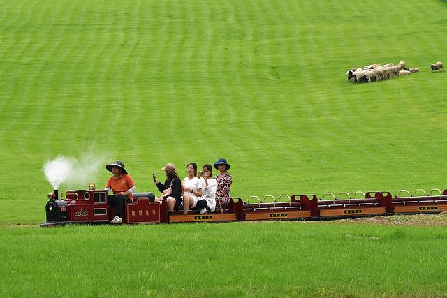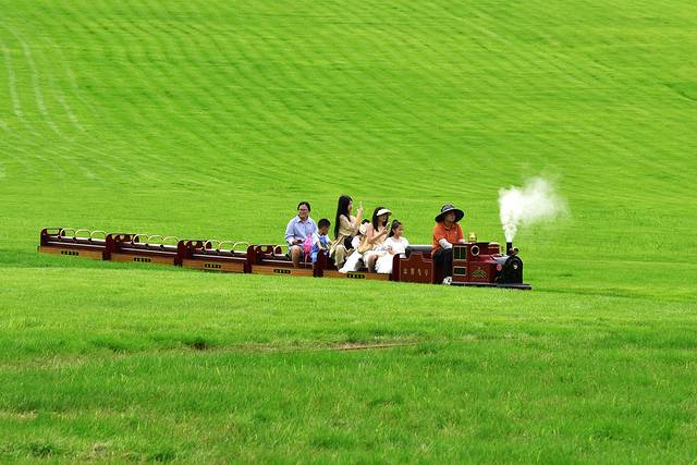 小火车是一个很好玩的体验,看上去不大,慢悠悠的行驶,没有滑草那么刺激,悠闲地移步换景,小火车在绿草之间冒着白烟,拍照很有画面感。