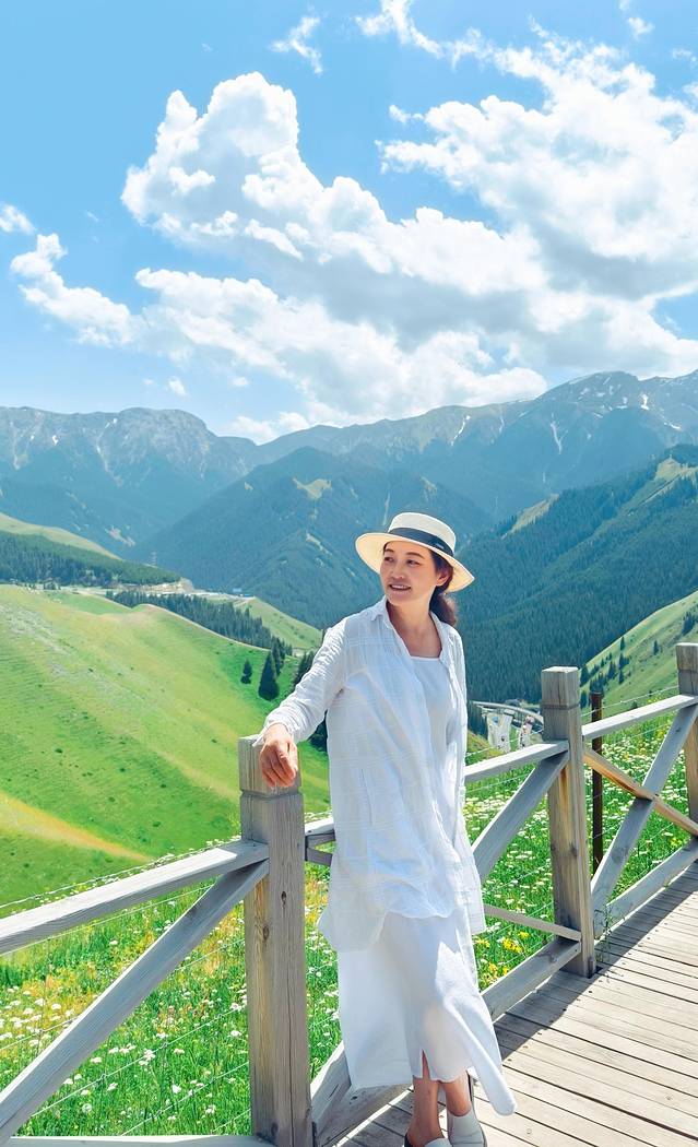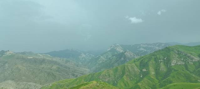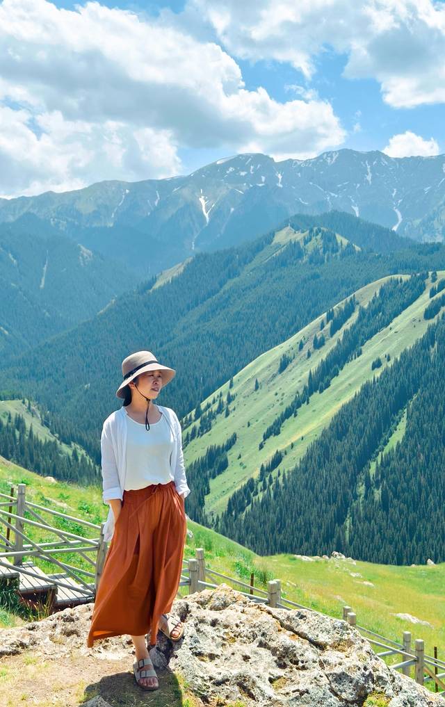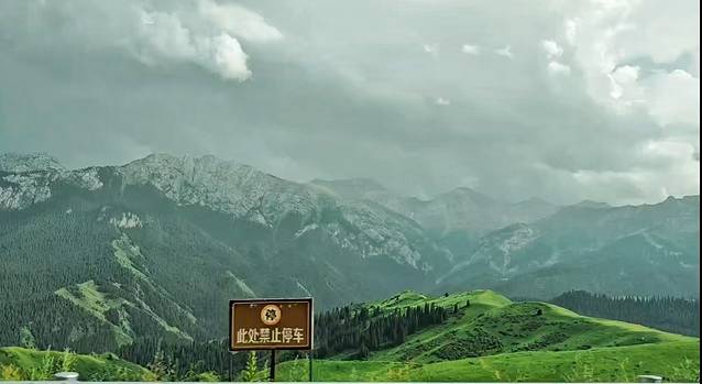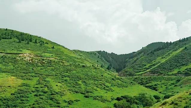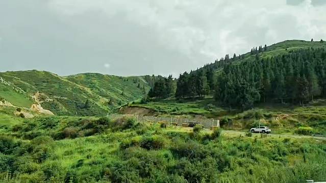 继续向前,从“骆驼驿站”开始进入山区,远处的山都是一眼望不到边的绿色,再加上树林的点缀,让人心旷神怡。