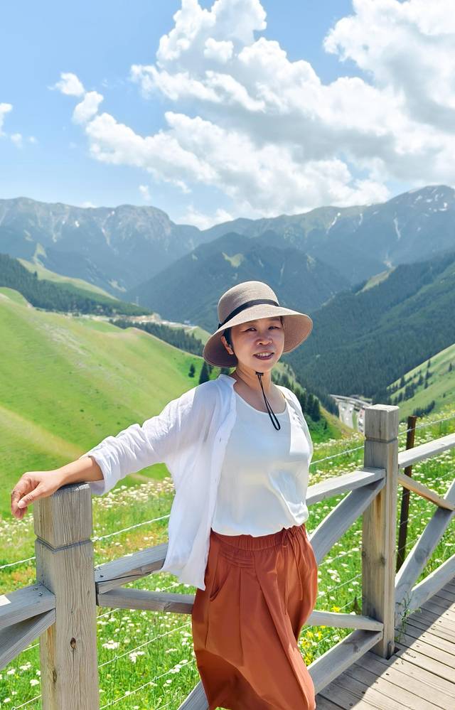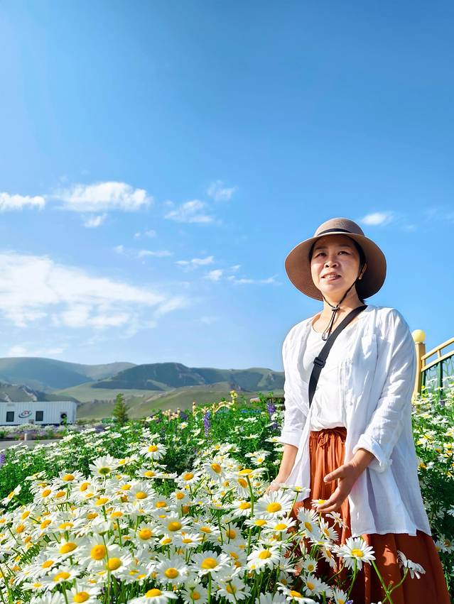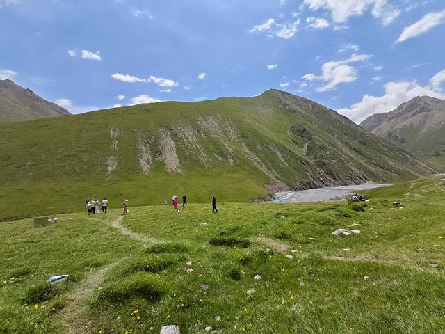 两边的山坡上像是铺着绿色的绒毯,草甸上开满了各色的小花,宛如金色的织锦交织在大地之上