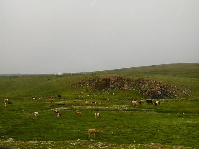 沉沉低压的云层下面是一望无际的绿色以及错落有致的牛羊群