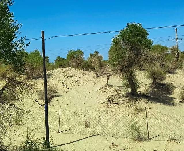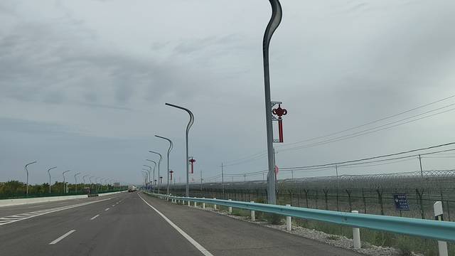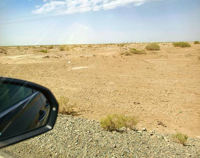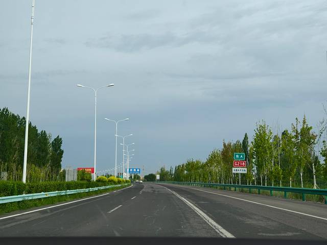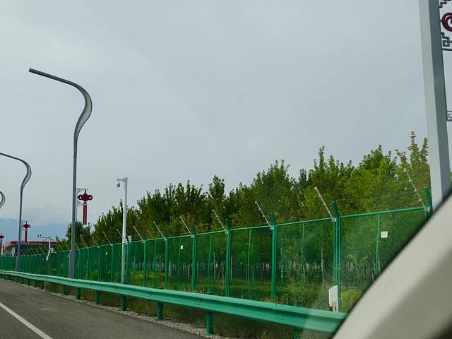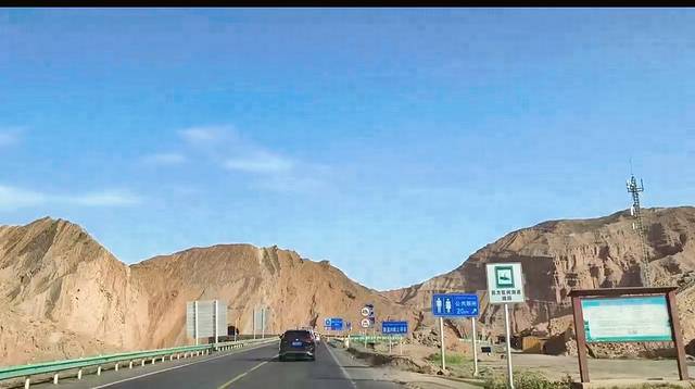 这一段的沙漠公路不是想象中的漫天黄沙,两旁种植了许多挡沙的灌木,闪过车窗的不再是一望无际的黄沙而是绵延不断的绿丛