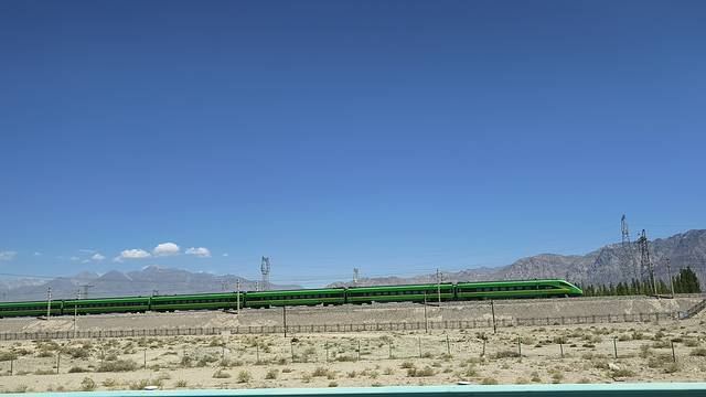 高速旁边的铁路线,绿皮火车飞驰而过,这应该是我们返程要乘坐的火车吧