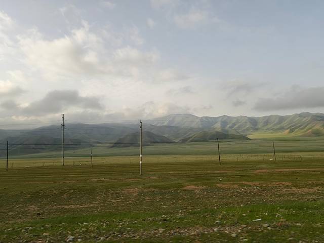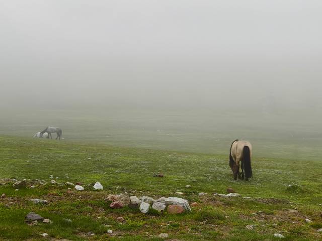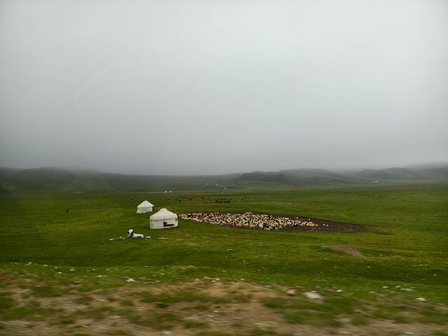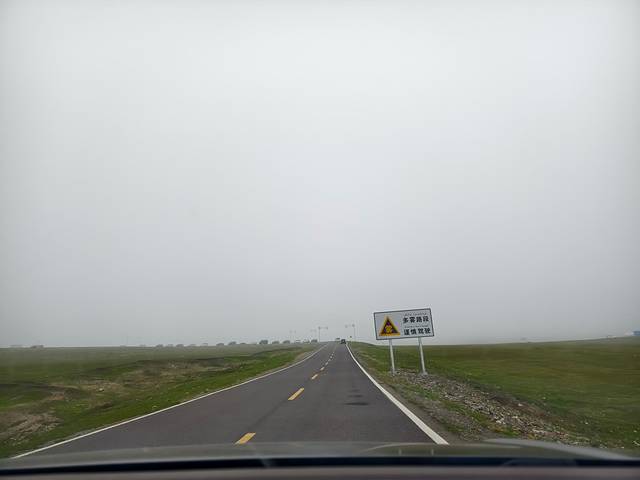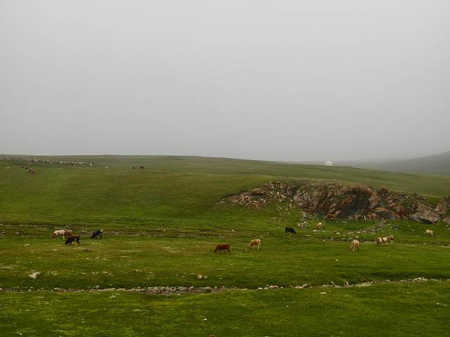 出小镇5Km左右,虽然能见度不是很好,但仍然可以看到起伏的山体线条和薄雾晨光里的草场
