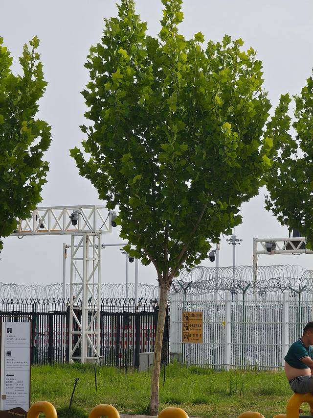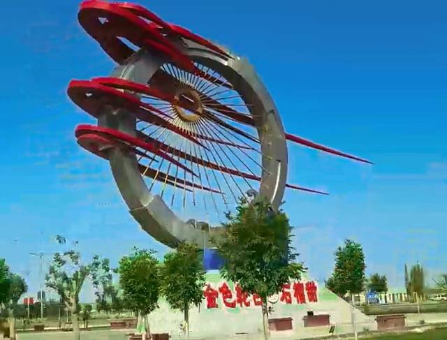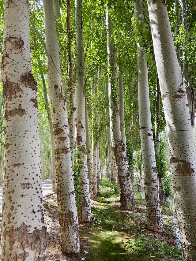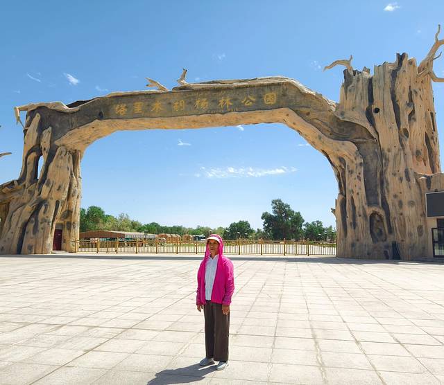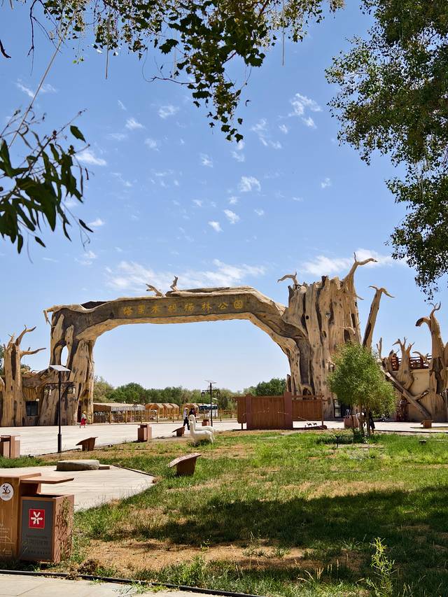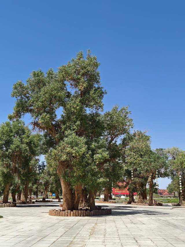 景区门口的广场上有很多粗壮的胡杨,它们的根须深扎土壤, 枝叶向着天空舒展开来, 仿佛在诉说着生命的力量与坚韧。