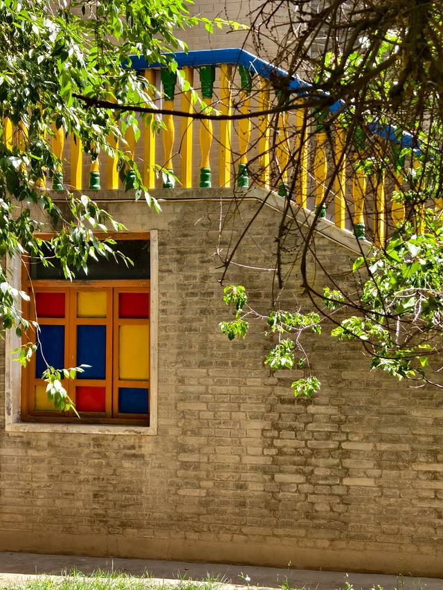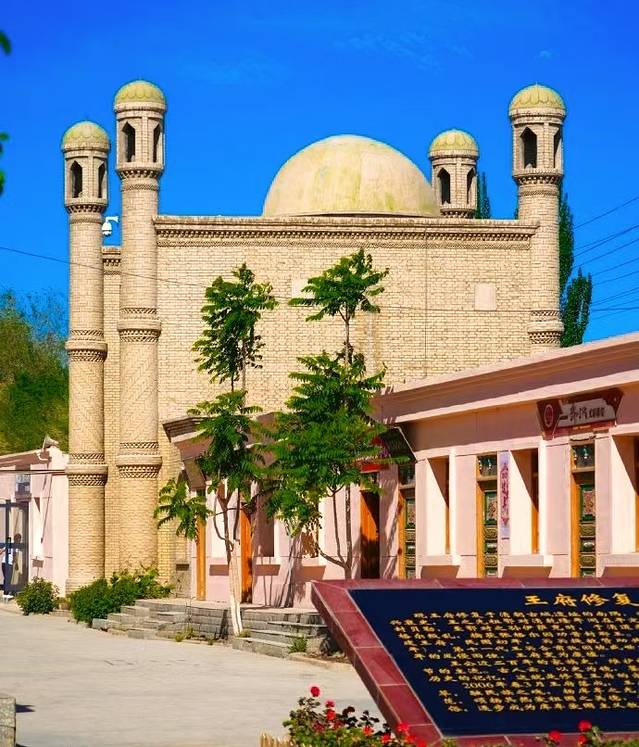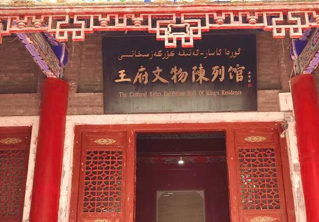 王府里有中原汉文化风格建筑,维吾尔族风格建筑,花园绿地,色彩鲜艳