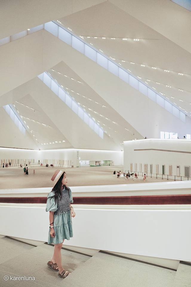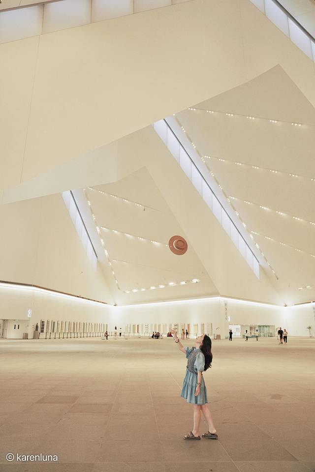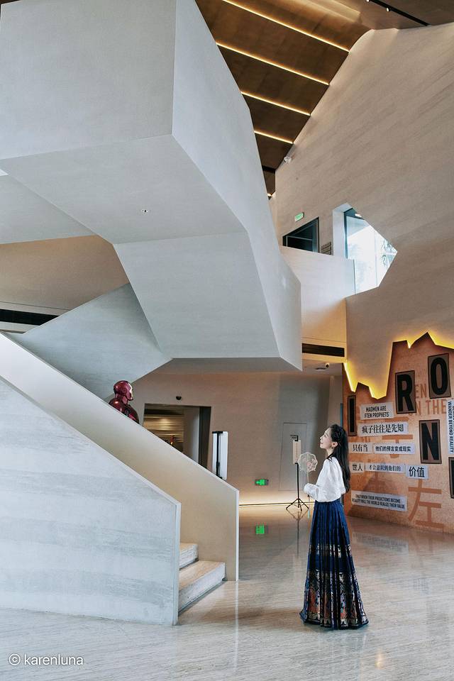 走进室内,高耸的纯白色几何空间造型,在暖黄色灯光下,凸显了韵律与极简的雅致。线条的流畅,与空间的空旷相得益彰,很适合拍摄那种空旷的环境人像。
