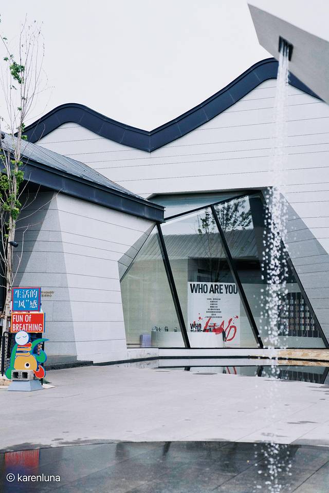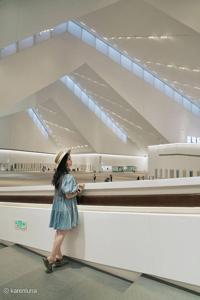 纯白色的艺术中心有着“瀑布”与“月台”衬托着,沿着楼梯走到尽头,可以仰拍到与太平楼同框的美照,如果等到晚上,艺术中心的墙壁上就会“升起”一轮圆月,便会让人有种奔月既视感。