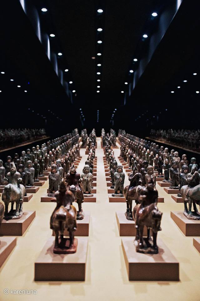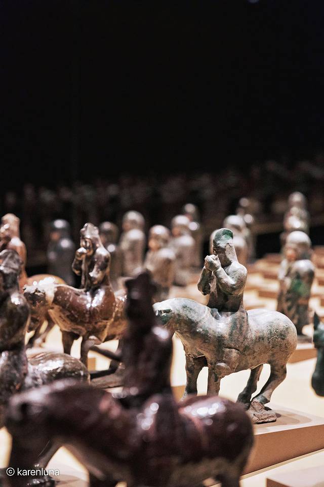 超过360件(展出了238件)釉陶俑仪仗队,是司马金龙墓的陶俑阵。陶俑数量之多、阵仗之庞大、细节至精巧都令人惊叹。8列形色各异的陶俑们按照当时贵族出行的仪仗规制,有序地排列着。跨马勒缰、躬身听命、手举兵器、严阵以待,每个小陶俑的神色都不一样,每一个细节都透露出匠人的精湛技艺和对逝者的深切敬意。它们静静地排列在展厅之中,仿佛在诉说着一段段古老而庄严的仪式。听到博物馆里的讲解说,这是国内迄今为止北魏时期阵容最大的俑阵。