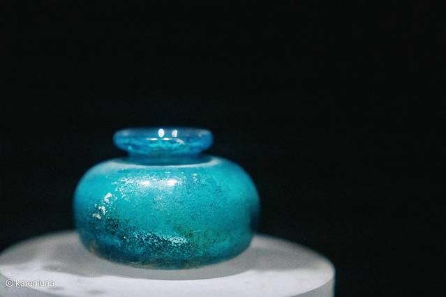 展厅的标签里虽然只写了简简单单的“玻璃小瓶”几个字,但确是经过1600年时光也未曾消磨绚烂的千年花华。于是自此在这历史的长河里,有一种蓝被叫“北魏蓝”。而这珍贵与独特的色彩,即使在这灯光昏暗的展厅里,也静静闪耀着它历史的温度。