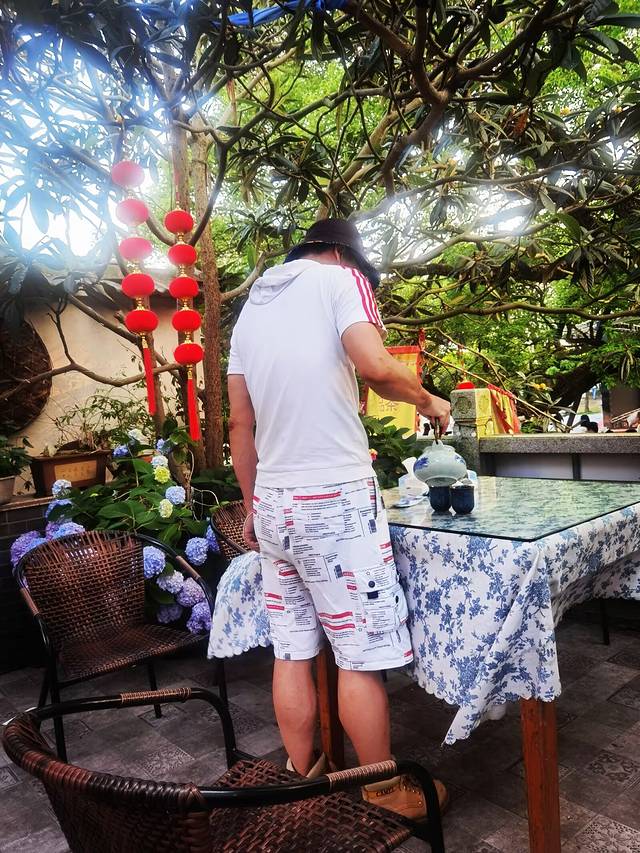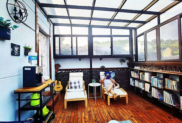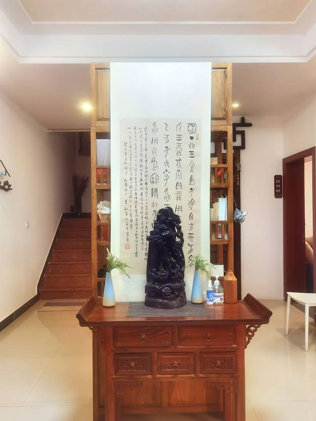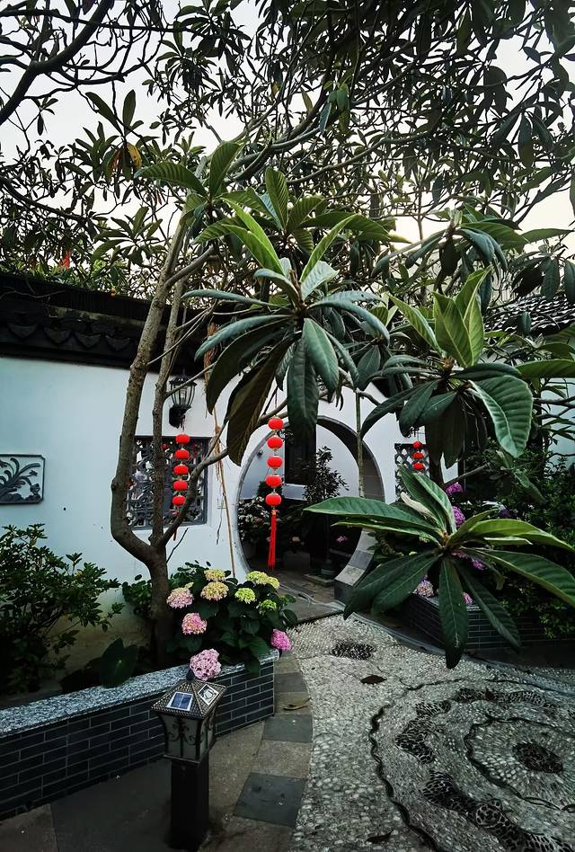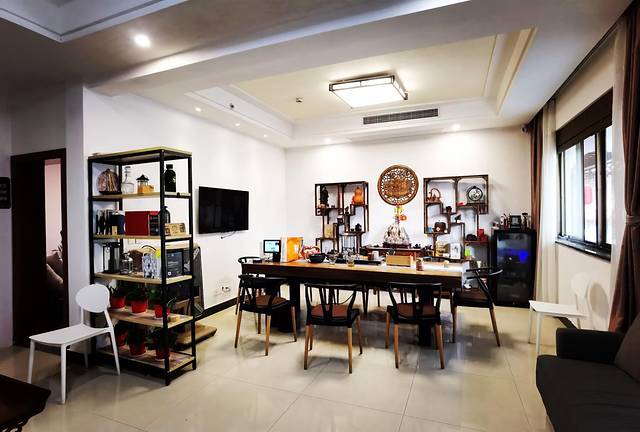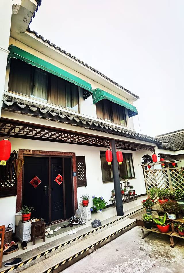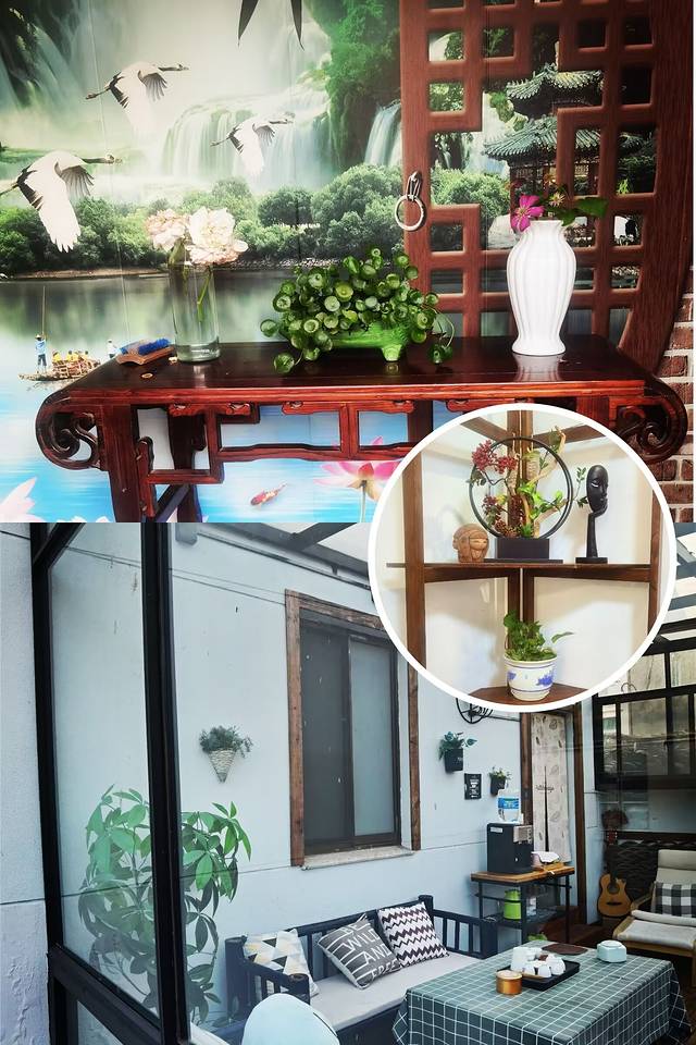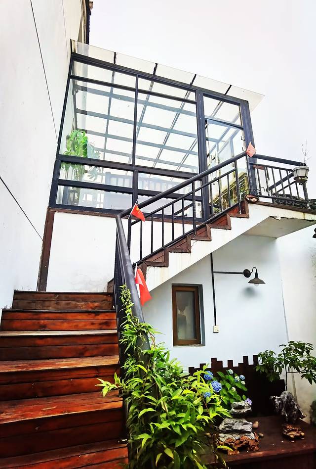 这是一栋三层的楼房,房前有个院子,院子里花卉草木+假山盆景+休憩桌椅,构筑了一个敞开式的社交空间,院子一角是厨房+餐厅的小平房,两楼转角楼梯上去有一个平台,平台上搭建了阳光玻璃房,这个阳光玻璃房是整栋楼的一个亮点。院子、屋内收拾的非常干劲整洁,进屋还要换鞋,就像在家里一样,心理感受很亲切、很舒坦、很惬意。
