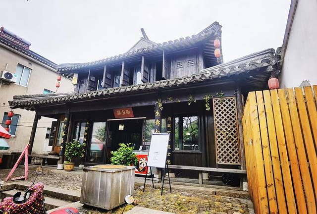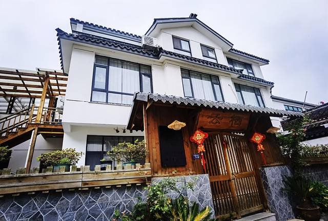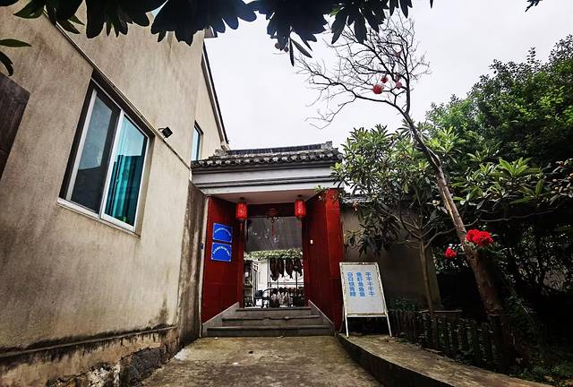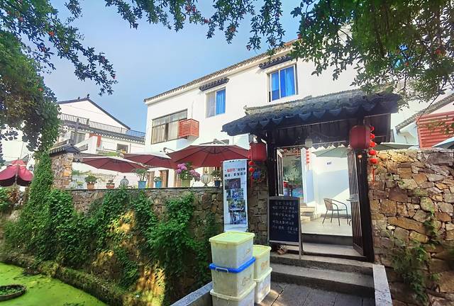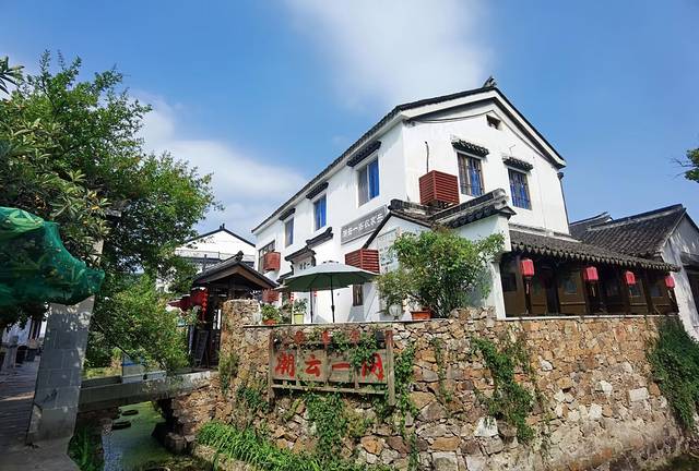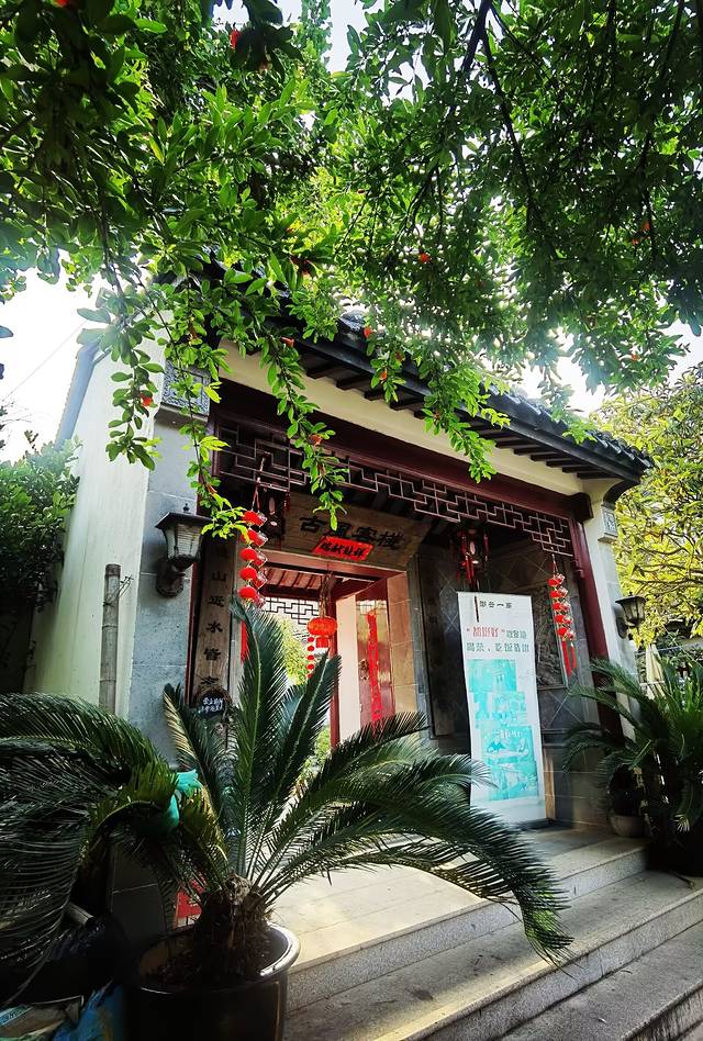 “潮云一阁”农家乐位于千年石板街入口的转角处,一边隔着水渠与石板街相对,一边隔着小河与古樟树相望,位置特别显眼,走过路过都要与之相遇。农家乐的正门开在石板街上,还有一个后门开在有更楼的这条巷子里,是一座庭院式结构的两层楼房,一楼室内有休息厅、包房和大厅,室外是个苏式风格的小庭院和一个露天平台式餐位,二楼是民宿,是一家吃喝玩乐挺完整的农家乐。