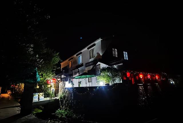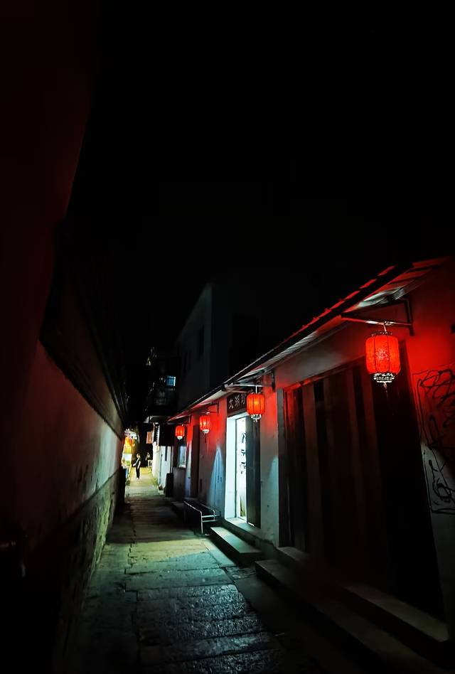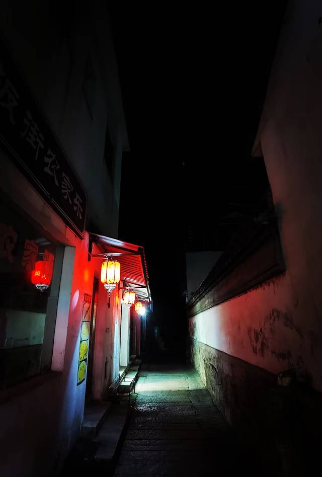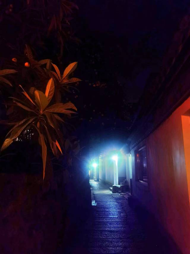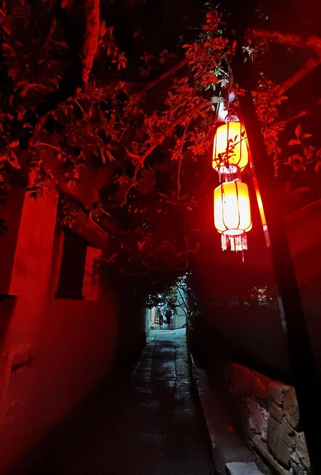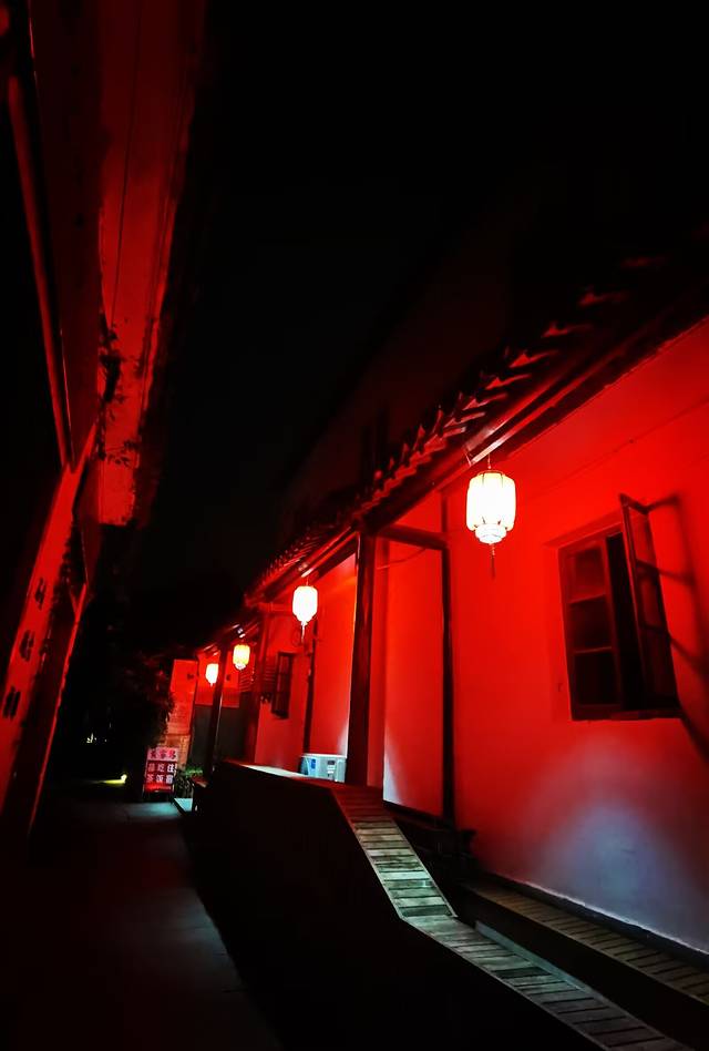 夜晚的明月湾村,一盏盏灯笼亮了起来,红灯+白月光投影在空寂的巷子里,把小巷子衬托得份外恬静和安宁,虽然少了城市里五光十色的霓虹和车水马龙的喧哗,却有着城市中难得一见的澄明和极其少有的清净。
