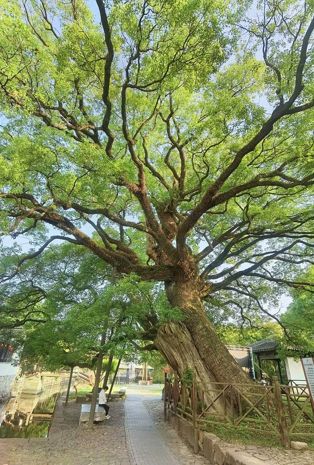 1、古樟树。古樟树位于村口的C位,树龄为1200年以上,主干直径约2米、树冠高约25米,种植于唐代,相传是唐代大诗人刘长卿到明月湾访友时种下的。这棵古樟树被火烧过、被雷劈过,还被日寇和土匪以砍伐古樟树相要挟,进行敲诈勒索,古樟树干根部至今还留有当时被砍伐时的累累伤痕,古樟树一边的树枝已经枯死,后发枝干倚背而生,村民们戏称这是“爷爷背孙子”!尽管这棵古樟树饱经沧桑、历经磨难,但是如今仍然如伞似盖、遮天蔽日,枝繁叶茂、生机勃勃,透射着顽强的生命力伫立在明月湾村口。当一个人站在这棵古樟树旁,着实显得格外的渺小。听村民说,他们很喜欢在树下的青石条长凳上乘凉唠嗑,树下是村里人社交的一个热门场所。于是,我也去小坐了一会儿,果然凉爽宜人,就这么一坐,竟然打了一个盹、还做了一场白日梦。