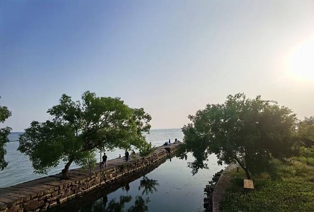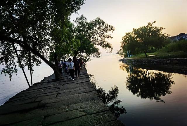 古码头始建年代不详,现存的古码头为清乾隆年间有村民集资重修的,古码头由256块花岗岩条石垒筑而成,长58米、宽4.6米,蜿蜒地斜向着伸入太湖之中,在以船泊为主要交通工具的以前,这里是村民们外出登船的必经之地。过去外出经商的村民大多行走于浙江湖州,而湖州入太湖的港口恰好对准了明月湾,所以古码头的方位指向了太湖对岸的湖州。现在的古码头是西山岛拍日落、观日落的最佳点位之一,看日落的人很多,有利地形和最佳位置不是很多,要早点过去、提前去抢占的哈。