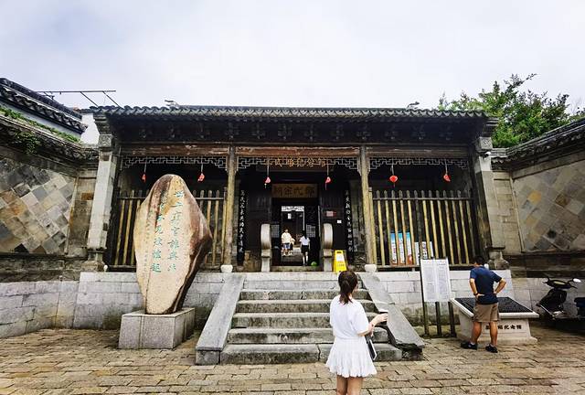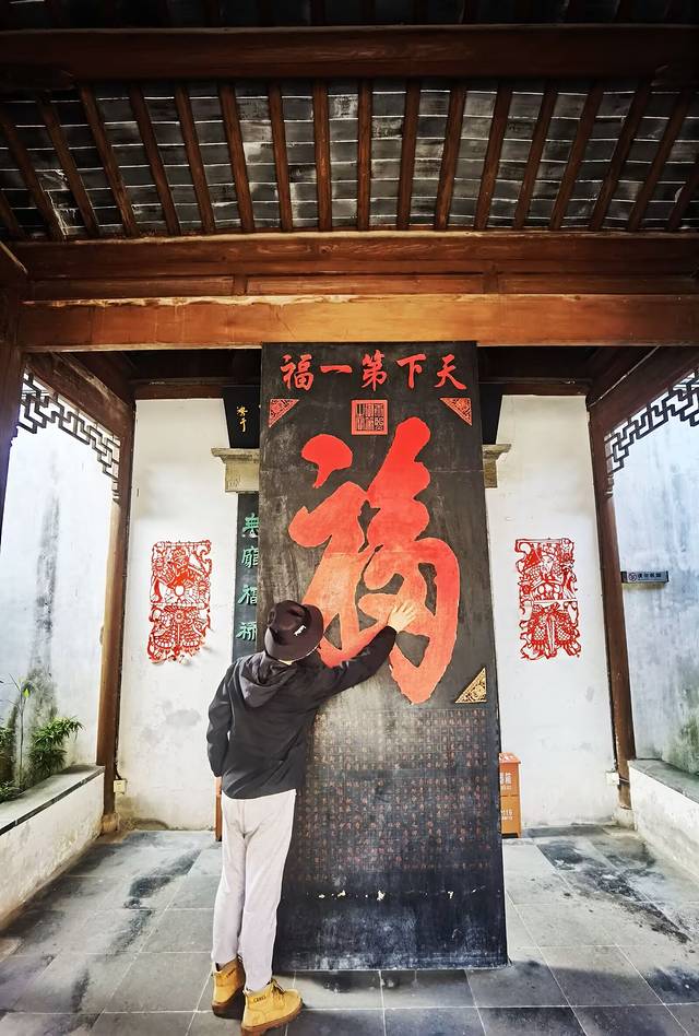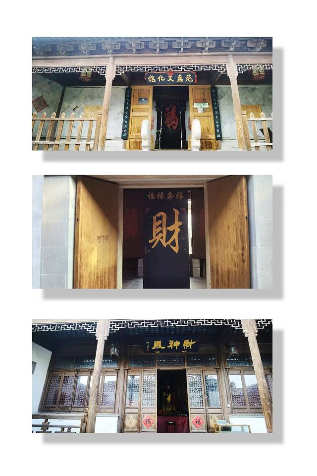 ②古祠。明月湾村有吴、黄、秦、邓四大家族,这四大家族在村里均立有祠堂,除了吴氏宗祠年久失修坍塌外,黄氏、秦氏、邓氏三家的宗祠都完好地保留了下来,其中,黄氏和邓氏两家的宗祠现在是需要买门票才可以进入参观,秦氏宗祠如今已改变了用途,变成了范蠡文化馆,文化馆是免票的!范蠡文化馆内有财神殿和“天下第一福”石碑,财神殿始建于隋朝末年,供奉的是文财神范蠡(陶朱公),这个“福”字据说是清代康熙帝的御笔。作为一个吃五谷杂粮的凡人,我没能脱俗,去摸了下福、许了个财运亨通的愿。结果是:被我逼着摸福许愿的小伙伴,在以后几天的牌局中,竟然赢了个钵满盆满。嘿~还真灵验!没白摸哈。