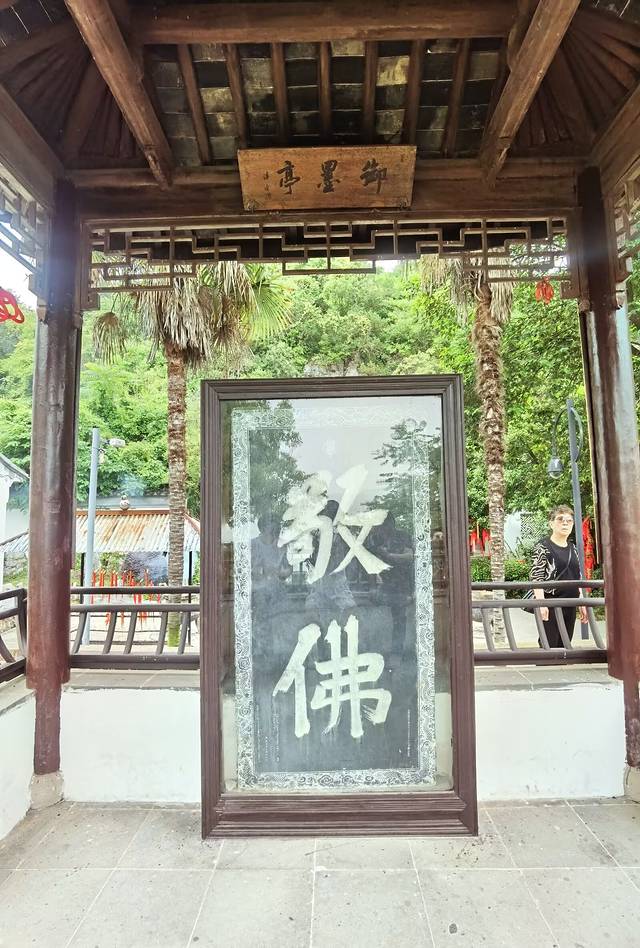 2、御墨亭。御墨亭里有一块“敬佛”的碑刻,“敬佛”二字为清顺治手书,顺治没下过江南,石公山怎么会有皇上的题碑?原来当年顺治在位的时候,西山岛包山寺主持山晓和尚应诏进京主持董鄂妃丧礼的佛寺活动,受到了顺治帝的赏识,于是得到了帝赐御笔“敬佛”二字,然后成为了包山寺的镇寺之宝;而石公山御墨亭中的这块,是清光绪年间依真迹临摹而刻。清溥仪之弟溥杰,曾为御墨亭题书了亭额“御墨亭”,现在还高高地挂在亭内,这座亭子留下了爱新觉罗皇族一头一尾两代人的墨宝,实实在在、耐人寻味。