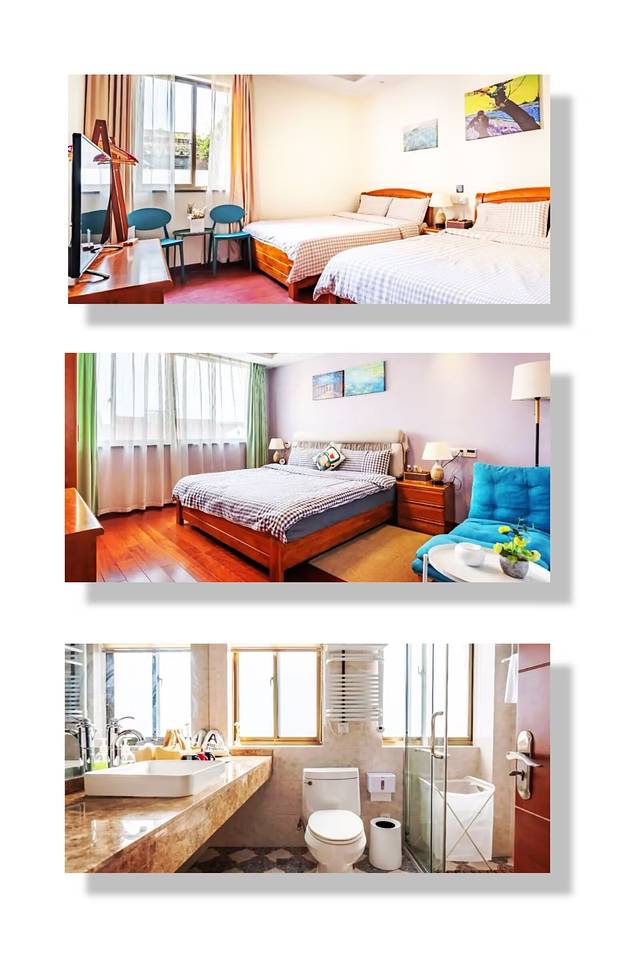 在这个家里住了两宿,体验过后觉得这个家不错,没有大毛病,不过有个小毛病,恕我直言。这个家一共有5套房,一楼2套房:1套为一室一厅一卫房型‖大床房+麻将房+卫浴,1套为二室一卫房型‖大床房+双床房+卫浴,一楼还有一个大大的客厅;二楼2套房:均为二室一卫房型‖大床房+双床房+卫浴;三楼1套房:一室一卫房型‖大床房+卫浴。小毛病就出在二楼的2套房内,这个套房内各有两个房间,其中有一个房间没安装房门,仅仅用移动围帘做隔断,这样的设计总觉得怪怪的!对入住在这两个房间内的人来说都很尴尬,私密性受到了挑战,为啥不做个门呢?有点百思不得其解。还好!我们一共12人,房间能分配过来,就让二楼2套房各住2人,让他们独享二室户,美一美,哈哈哈哈~如果这个套房真的住进4个人的话,还真的不自在,囧死了!