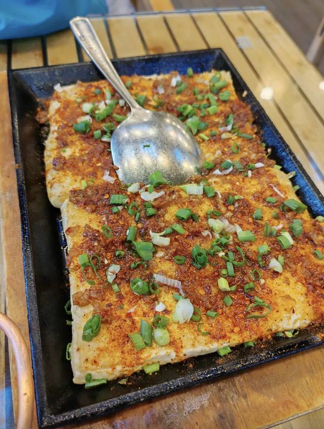 铁板爆浆豆腐表面麻辣香,内里口感滑嫩有奶滑感。