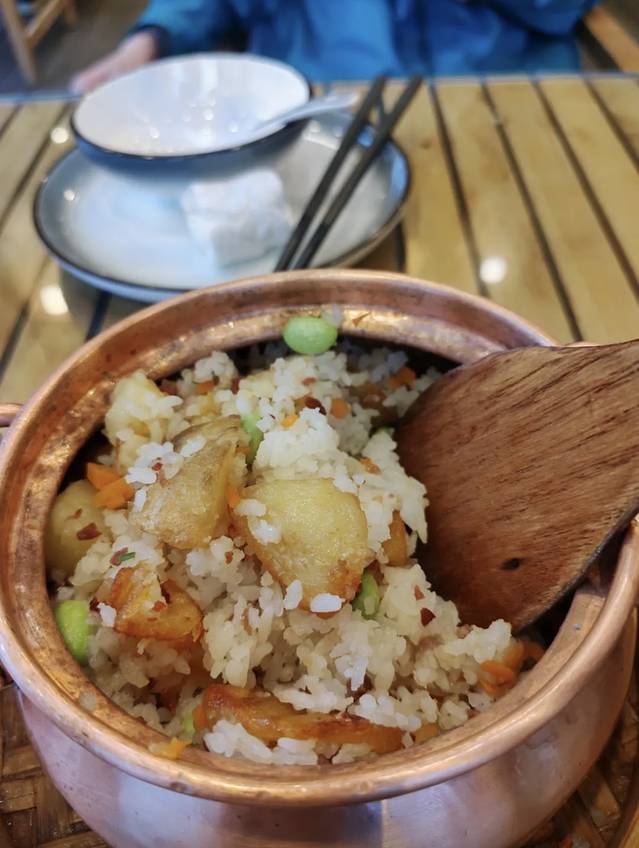 招牌小锅饭没让人失望,土豆煎过后表面有酥香感,小颗粒的云腿咸鲜得恰到好处,毛豆绿得很新鲜。分寸感很好的锅饭。