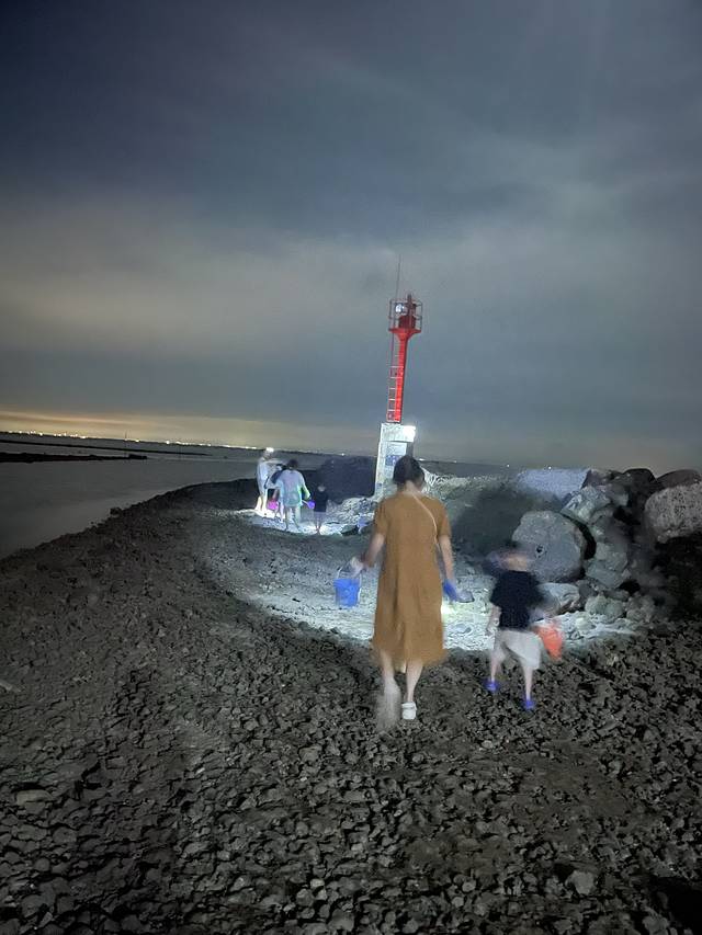今天天气有点阴,白天涨潮了,夜晚就是在这海面捡的生蚝哦!