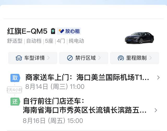 原本计划在一嗨租车上订,连锁,服务好,结果我8月准备下单的时候,比7月贵多了,就放弃了。怀着忐忑的心在携程上订了红旗电车加了保险,还车挺顺利,取车服务不错,就是还车时希望能送到码头没能如愿,感觉上欠了点。