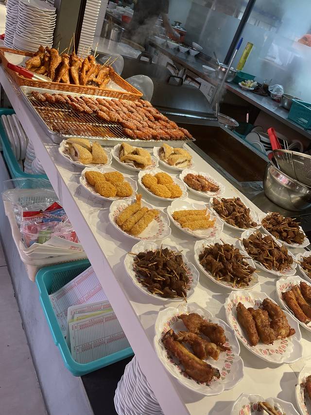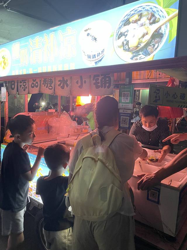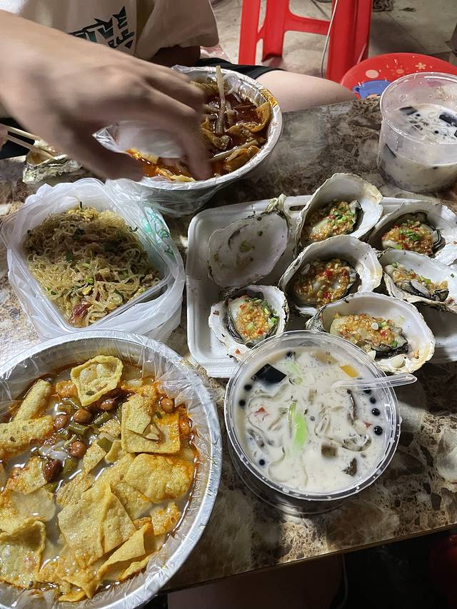 距离目的地还有20分钟车程的时候,实在有些饿了,还好路过了一个镇。停下来就餐,结果发现这里晚上好热闹,夜市摊上各种吃的,我们点了炒饭,螺蛳粉,清补凉,烤生蚝等等等,价格也好便宜。