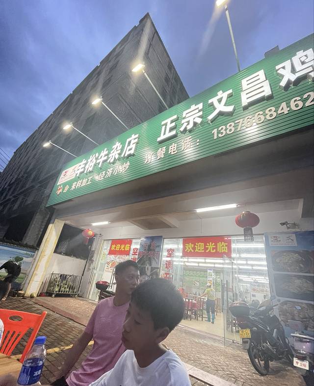 酒店附近几乎没有吃的,都是在龙楼镇上吃的,人也比较多,距离酒店3公里吧!晚上也挺热闹的,我们美团上看了一家文昌鸡+牛杂店。