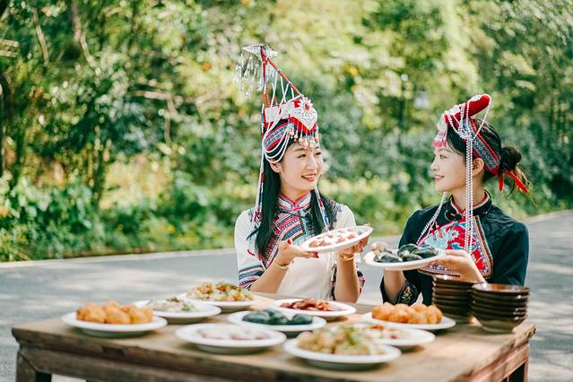 在景区入口有畲族迎客体验,畲族姑娘穿着畲族华服、唱着迎客歌、用竹筒给游客献上一碗大茅山独特的茶,很是特别!(畲族迎客并非每天都有,详情可以咨询景区),还有大茅山迎客六粿宴,有乌佬粿、汤头粿、米粿、南瓜粿、板粿和芝麻粿六种特色小吃,也寓意着六六顺、事事顺。