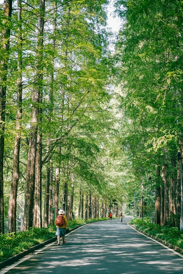 景区内可步行或坐观光车游玩,观光车往返20,随叫随停,很方便。景区入口就是逍遥路,两旁是高大的水杉,绿荫蔽日舒适凉爽,秋天还能看到满路水杉金黄的绚烂美景。