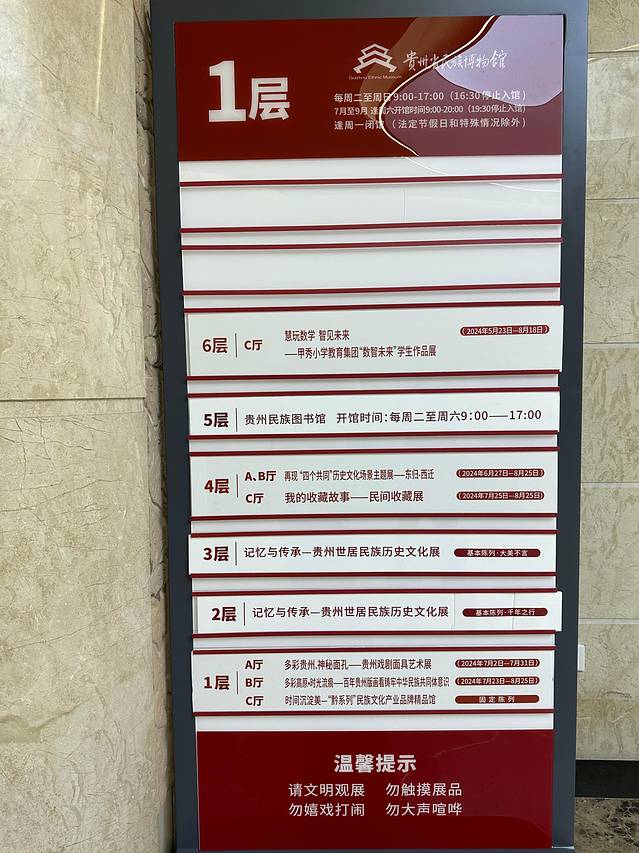 贵州省民族博物馆,隶属于贵州省民族宗教事务委员会,是县处级公益性事业单位,位于贵阳市迎宾大道遵义路筑城广场的南广场,东依贵阳市南明河,西邻贵阳火车站,总占地面积13175平方米,是在2007年建成的贵州民族文化宫大楼的基础上,于2012年正式挂牌成立的全国第五个省级民族博物馆。