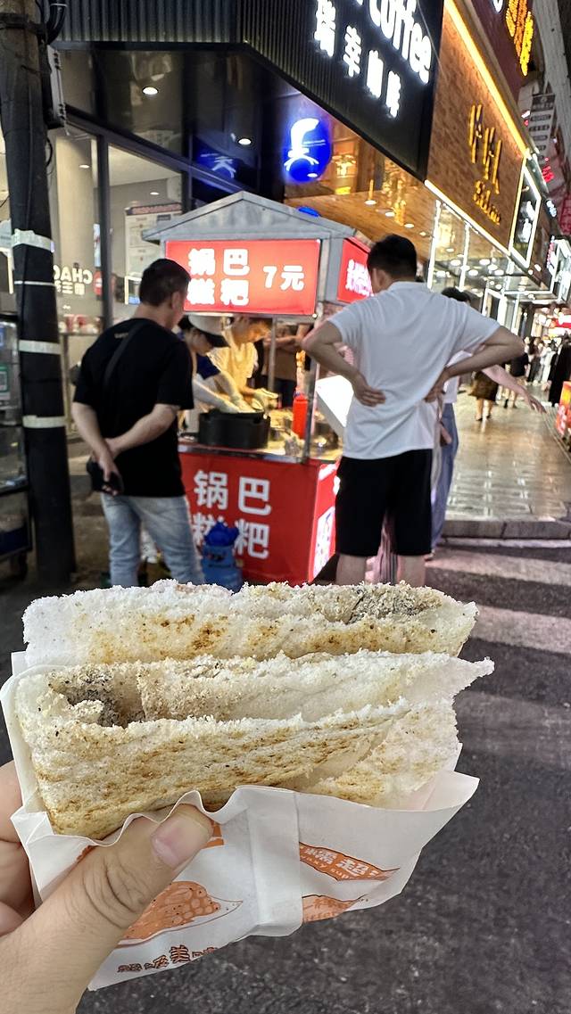 d:趁热将锅巴揭下,放上一小块软糯的糍粑;