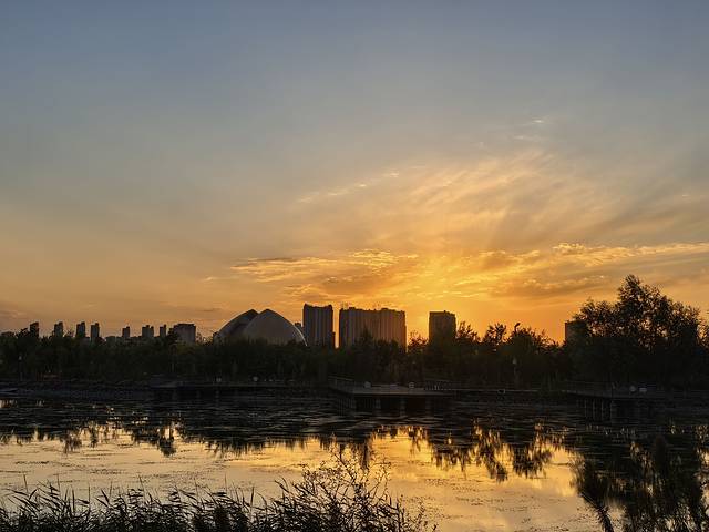 第二天转机到了新疆,住在新疆大剧院边上的兵旅天缘酒店。晚饭后落日余晖,给大地铺满了金装。