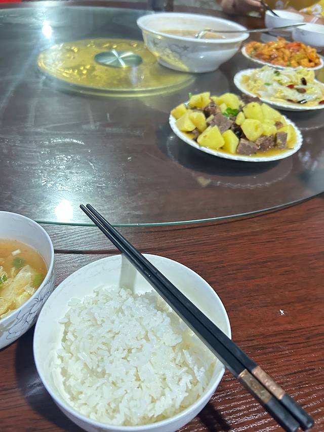 土豆烧牛肉、鱼香茄子、醋溜白菜、西红柿鸡蛋汤、青菜豆腐。