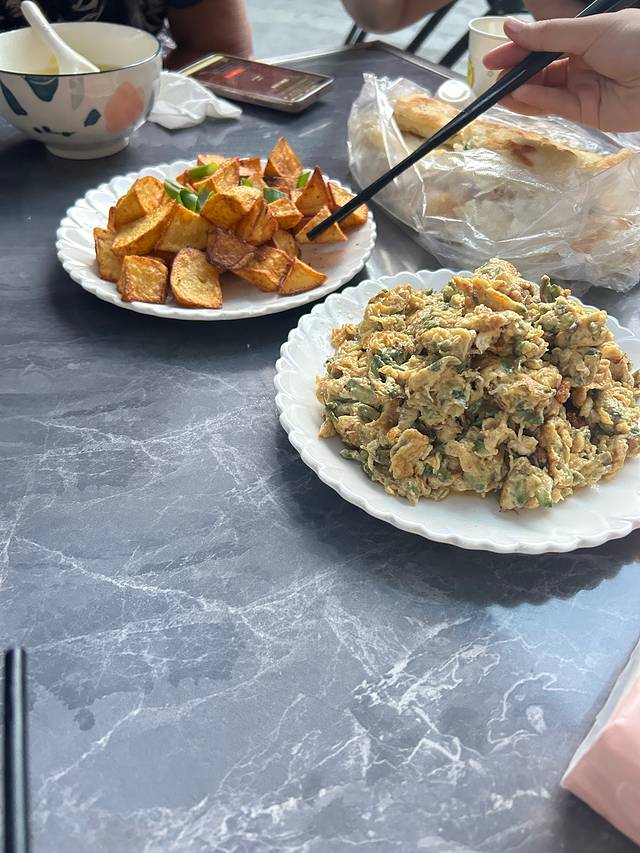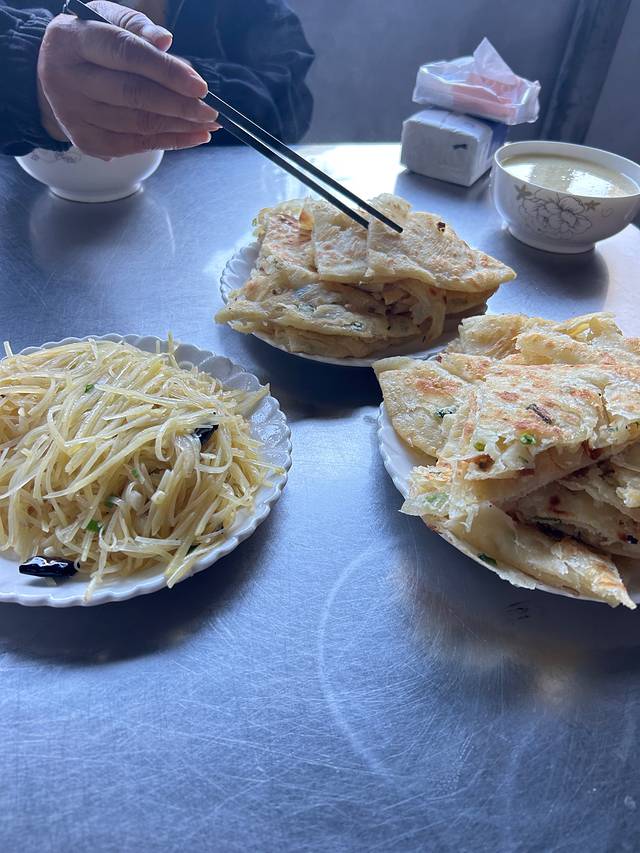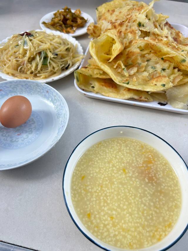 早饭时间:油饼、醋溜土豆丝、玉米糁汤