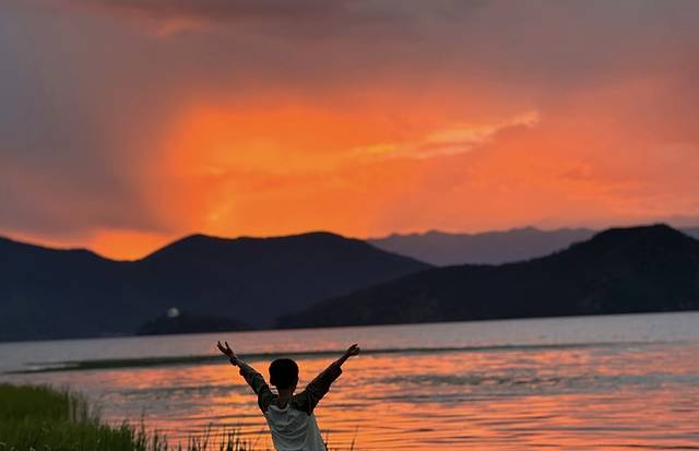 D4:丽江-泸沽湖,3.5小时,今天天气突然很好了!来3天丽江,在离开的这一天,终于能看到玉龙雪山雪峰了,虽没能看到日照金山,可是已感到幸运了。到到泸沽湖,民宿老板说,今天是整个7月唯一没下雨的一天了,于是,我们在泸沽湖边上,还看到了我此生看过最美的晚霞。