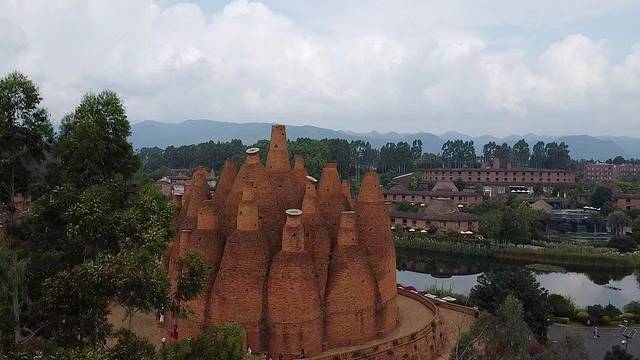 第二天带上我的无人机去打卡东风韵,景区人比较多。在周边转了一圈,这几个酒瓶子里面是可以喝咖啡休息一下的,每个酒瓶子的顶部是采光的,这个就是工艺学设计啦