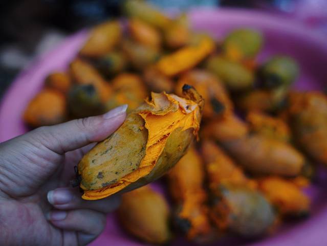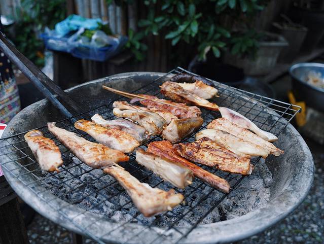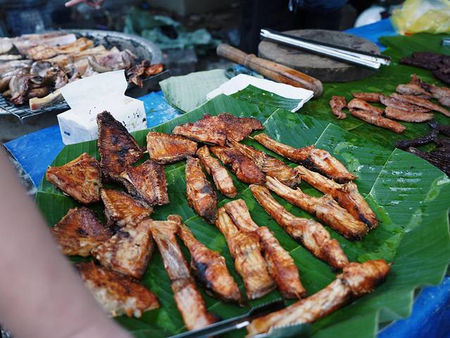 水果蔬菜的品类不多,一些常见的东南亚香料配菜,正经的青菜没有太多,很多也是歪瓜裂枣的样子应该也长得很艰辛。鱼摊倒是震惊了我,很多鱼的块头都非常大,甚至比小乳猪还大。