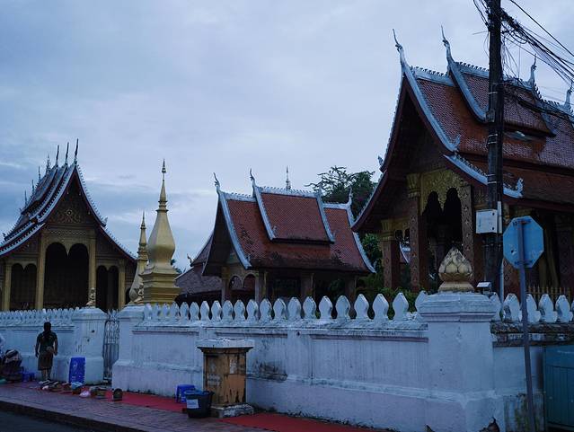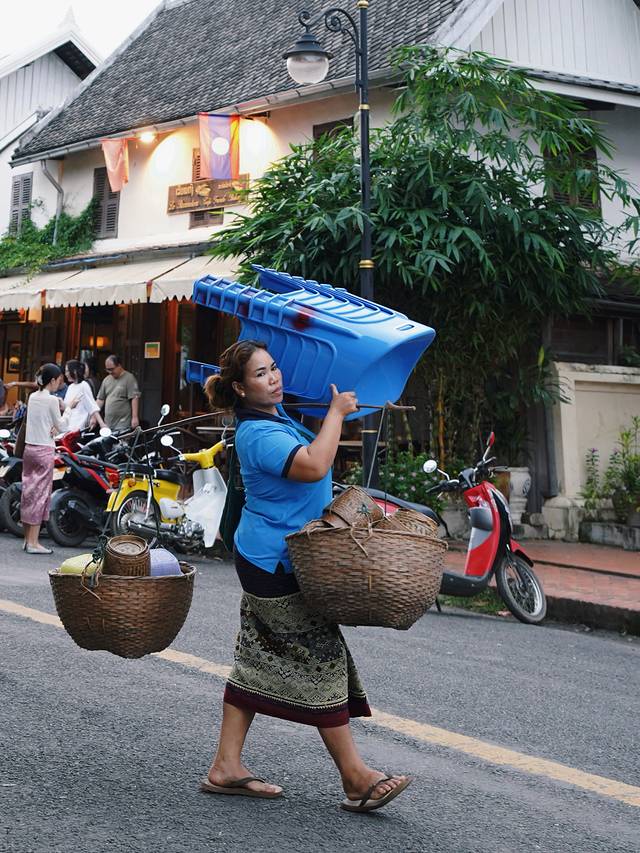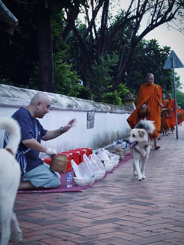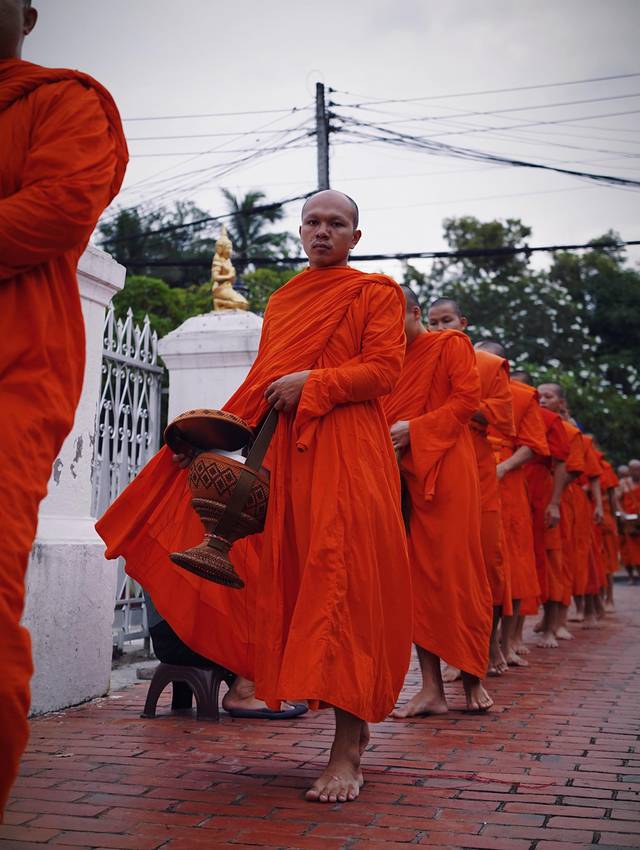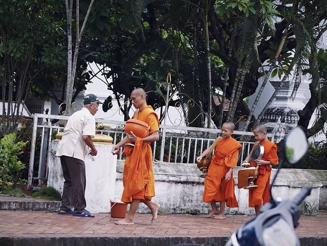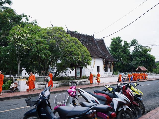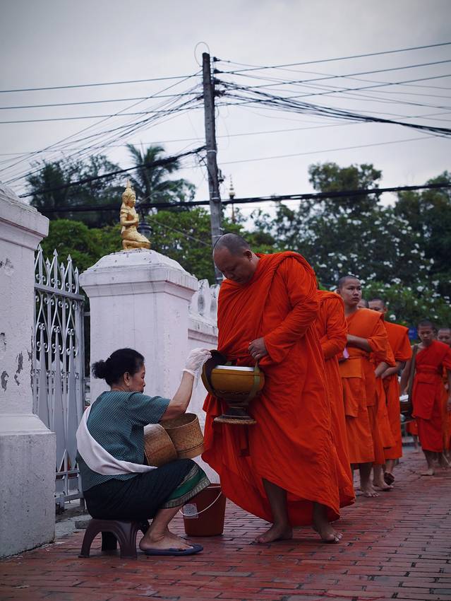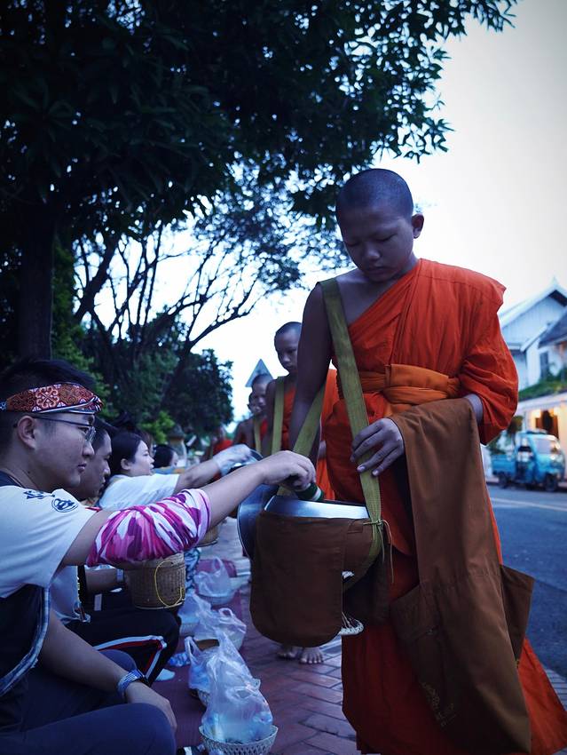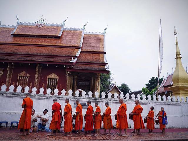 琅勃拉邦的一天从清晨的布施开始。每天清晨天未亮当地的民众就准备好米饭、菜肴、饮料等食物,排队在寺庙外的台阶上等待僧侣外出者化缘。